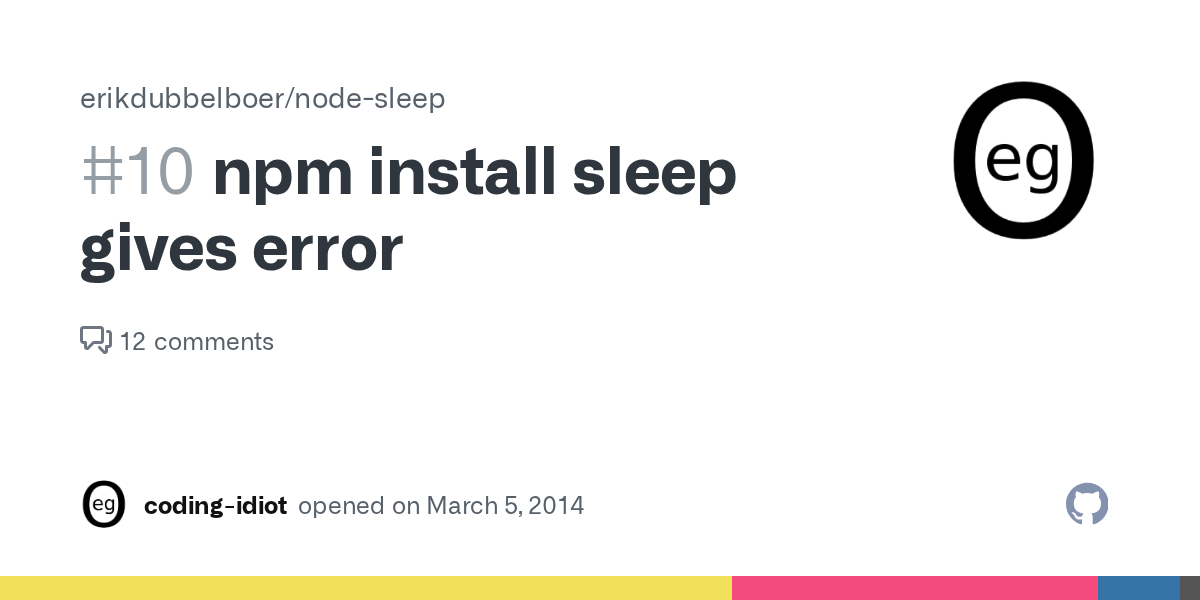 Dependencies 0 dependent packages 3 dependent repositories 0 total releases 1 latest release mar 9, 2020 first release mar 9, 2020 stars 22 forks 2 watchers 2 contributors 1 repository size 3.91 kb documentation. These calls will block execution of all javascript by halting node.js' event loop! Add sleep(), msleep() and usleep() to node.js, via a c++ binding. Sleep (1000) the console.time will report a time of just over 1000ms despite the settimeout being 100ms. Dependencies 0 dependent packages 3 dependent repositories 0 total releases 1 latest release mar 9, 2020 first release mar 9, 2020 stars 22 forks 2 watchers 2 contributors 1 repository size 3.91 kb documentation. Npm install run tests npm test support. For node, atomic sleep can provide zero cpu overhead sleep from node 8 and up. Node and browser versions that support both sharedarraybuffer and atomics will have (virtually) zero cpu overhead sleep. Dependencies 0 dependent packages 3 dependent repositories 0 total releases 1 latest release mar 9, 2020 first release mar 9, 2020 stars 22 forks 2 watchers 2 contributors 1 repository size 3.91 kb documentation.